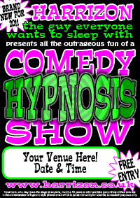 When you book Harrizon the Hypnotist for your venue, almost anything can happen...and often does. His unique style of humour, and amazing skills, along with the particpants' own imaginations will leave everyone laughing, and talking about the show (and more importantly - YOUR VENUE) for a very long time.